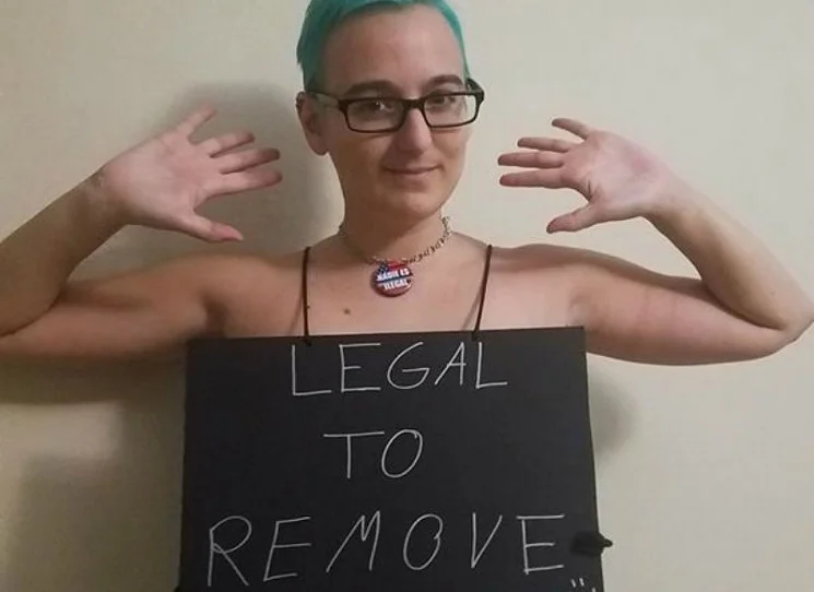 Plaintiff Brit Hoagland poses with a decorated placard reading ”LEGAL TO REMOVE” while wearing a nude colored binder.